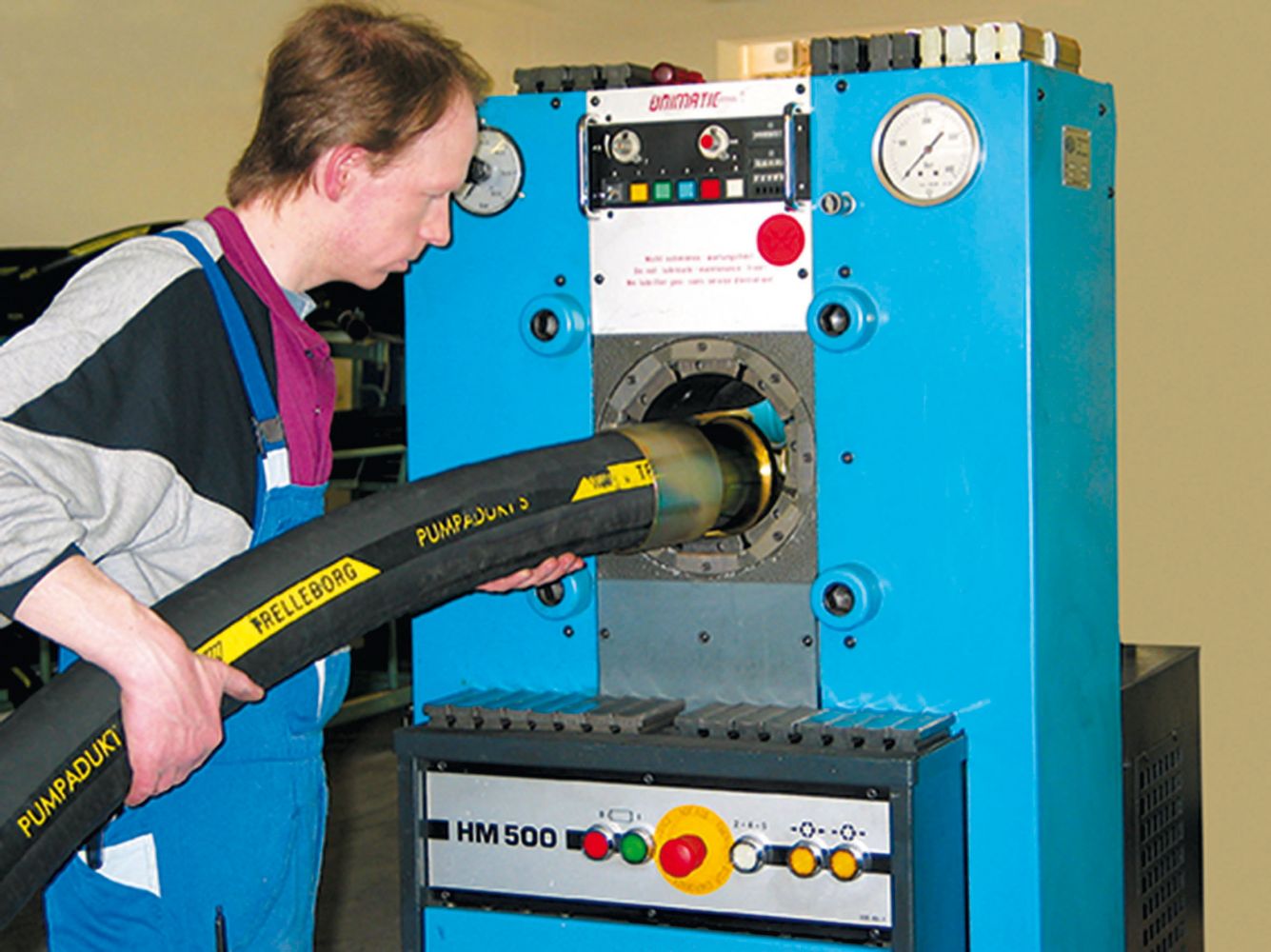 Mitarbeiter mit konfektionierter Saugleitung DN 100, vorbereitet zum Einpressen auf einer Großpresse.