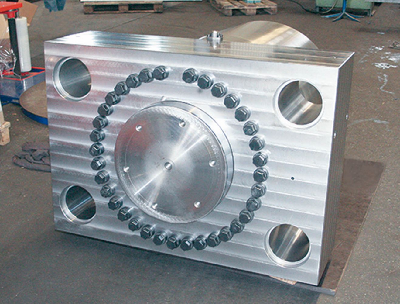 Rohr Ø 920 mm, Kolben Ø 610 mm, Stangen Ø 520 mm, Rechteckkopfflansch 1300 mm x 920 mm x 400 mm. Druck P-max 500 bar, Presskraft 1500 t, Eigengewicht 9,0 t.